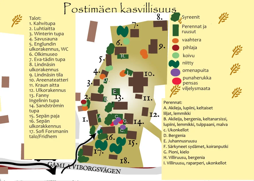 Postimäen viheralueet ovat vuosien varrella muuttuneet hyötypuutarhoista nurmikkoalueeksi. Syreenipensaat ovat saaneet kasvata vapaasti ja juhannusruusupensaikko on vuosien varrella kasvanut valtavaksi.