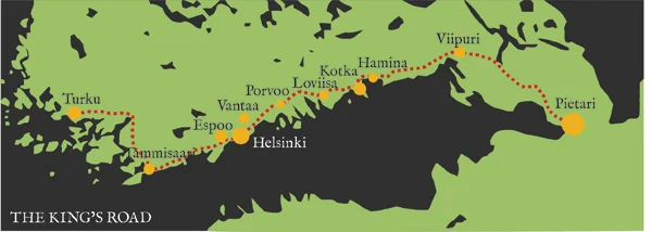 Formerly called the Great Coastal Road or the Lower Viipuri Road, the King's Road goes all the way from the Atlantic coast of Bergen past Oslo and Stockholm to Mariehamn. From the Finnish archipelago it streches past Turku and along the southern coast to Vyborg (Viipuri) and to St. Petersburg.